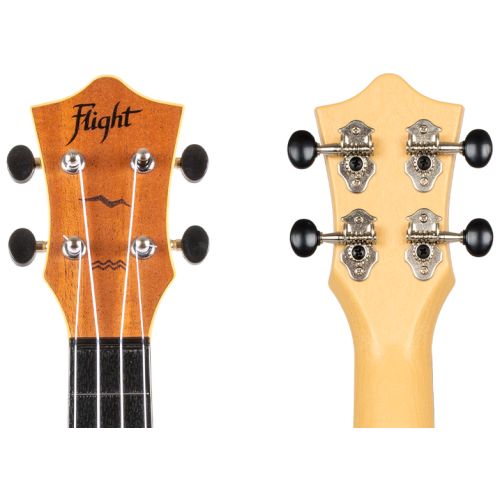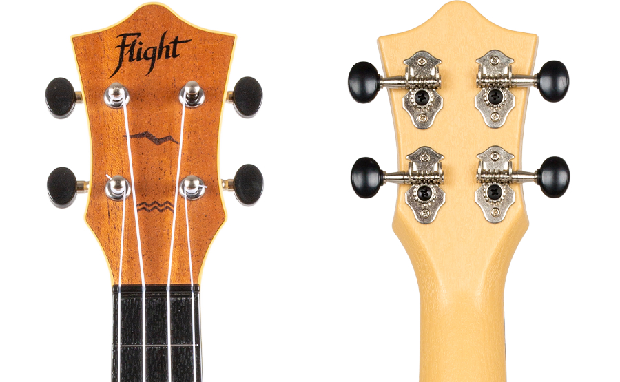 El diseño del cabezal es una parte integral de nuestra identidad. La chapa del clavijero está hecha de caoba laminada y combina con la placa de sonido del ukelele. Todos los ukeleles Flight cuentan con un cabezal cuidadosamente diseñado equipado con afinadores engranados que siempre mantendrán su afinación (una vez afinados).